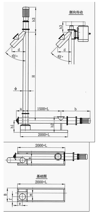 2、螺旋輸送機分水平槽機體(即喂料螺旋槽機體)和垂直機體兩部分。垂直機體分頭節(jié)、中間節(jié)、尾節(jié)三部分,每一部分又有集中不同規(guī)格的長度依機高選擇,可組成3~15m不同高度的整機,螺旋機每增加0.5m為一高度規(guī)格,供用戶選擇。